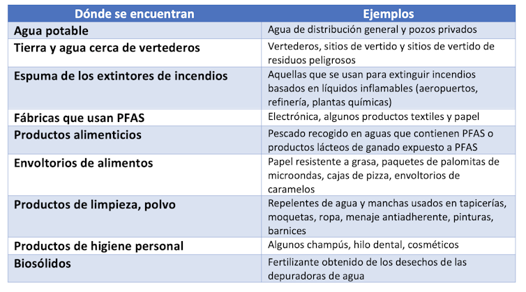 Es el caso de las sustancias perfluoroalquiladas, o PFAS por sus siglas en inglés. Se trata de compuestos químicos con una gran capacidad de repeler el agua que se utilizan en la fabricación de muchos materiales presentes en objetos de uso cotidiano (Tabla 1).